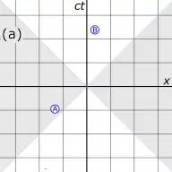 Fig. 3‑1a. Draw the and axes of frame S. The axis is horizontal and the (actually ) axis is vertical, which is the opposite of the usual convention in kinematics. The axis is scaled by a factor of so that both axes have common units of length. In the diagram shown, the gridlines are spaced one unit distance apart. The 45° diagonal lines represent the worldlines of two photons passing through the origin at time The slope of these worldlines is 1 because the photons advance one unit in space per unit of time. Two events, and have been plotted on this graph so that their coordinates may be compared in the S and S' frames.