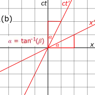 Fig. 3‑1b. Draw the and axes of frame S'. The axis represents the worldline of the origin of the S' coordinate system as measured in frame S. In this figure, Both the and axes are tilted from the unprimed axes by an angle where The primed and unprimed axes share a common origin because frames S and S' had been set up in standard configuration, so that when