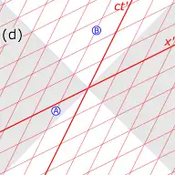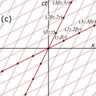 Fig. 3‑1c. Units in the primed axes have a different scale from units in the unprimed axes. From the Lorentz transformations, we observe that coordinates of in the primed coordinate system transform to in the unprimed coordinate system. Likewise, coordinates of in the primed coordinate system transform to in the unprimed system. Draw gridlines parallel with the axis through points as measured in the unprimed frame, where is an integer. Likewise, draw gridlines parallel with the axis through as measured in the unprimed frame. Using the Pythagorean theorem, we observe that the spacing between units equals times the spacing between units, as measured in frame S. This ratio is always greater than 1, and ultimately it approaches infinity as