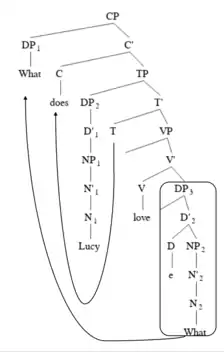 b) [DP2 What] does Lucy love ___?