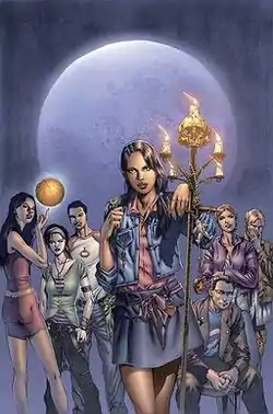 ![]() Cover to Spellbinders #1 Picture from left to right Mason, Renata, Paul, Kim, Foley, Mink and Liza Beth Art by Mike Perkins | |