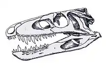 Out of the early crocodylomorphs, Sphenosuchus was one of the largest. The skull was 192 mm in the length and the body an estimated total length of 1.4m. This genus is considered to have been carnivorous and cursorial.[3] The found specimen consists of a nearly perfect but slightly crushed skull, a shoulder girdle, and a few limb bones so most of the known features come from the skull. The primary head of the quadrate meets the prootic and squamosal. The quadrate and pterygoid are not fused to the braincase and the basipterygoid articulation is free.The dentary is not gracile and has anterior swelling.[4] The parietals are fused together. The post temporal fenestrae are known for the Sphenosuchus with the sizes being very variable among early Archosaurs but rather small in size for Sphenosuchus [5] Has a scapula blade in a triangular shape. No clavicles present. Metatarsal I is reduced, II and IV are symmetrical and III is the longest. The nasals are long and narrow and pass from near the plane passing through the front of the orbits to the extreme anterior points of the snout. The frontals are large relatively and help to form a small part of the upper orbital margin and a large portion of the upper temporal fossa. The jugal is a large bone forming the whole of the lower orbital and almost all of the lower temporal bar. The parietal is a good sized element forming nearly the entire intertemporal region along with the majority of the occiput. There is no parietal foramen present. The dentary is slender and moderate in length, it appears to have roughly fourteen teeth with a third of them being larger than the others. Overall the skull is similar to those of crocodiles however it is slightly deeper.[6]