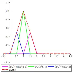 The cardinal B-splines are defined recursively starting from the B-spline of order 1, namely , which takes the value 1 in the interval [0, 1) and 0 elsewhere. Computer algebra systems may have to be employed to obtain concrete expressions for higher order cardinal B-splines. The concrete expressions for cardinal B-splines of all orders up to 6 are given below. The graphs of cardinal B-splines of orders up to 4 are also exhibited. In the images, the graphs of the terms contributing to the corresponding two-scale relations are also shown. The two dots in each image indicate the extremities of the interval supporting the B-spline.