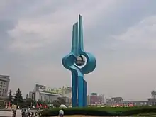 The famous statue, Spring, with 38.11 meter height and 170 ton weight at the center of square is designed by Tianren Wang from Xi'an Academy of Fine Arts. The inspiration of this statue comes from the "Spring" (泉) character in Seal Script (篆), which is an ancient style of Chinese calligraphy. It now has become a symbol of Jinan.