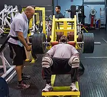Kirk Karwoski completing a heavy squat in competition. Note the spotters either side of him and the power cage which the barbell was lifted out of.