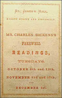 In 1868, famed Victorian author Charles Dickens presented a final series of "Farewell Readings," at the hall, which commenced on the evening of October 6, with a program devoted to "Doctor Marigold" (from the Christmas Story) and "The Trial" from Pickwick. He had settled with his tour managers, Chappell & Co., on 100 readings for the princely sum of £8,000 pounds. Attendees would receive printed programs and Chappell's advertisements included the following statement: