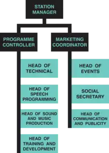 The current committee structure has three signatories: Station Manager, Programme Controller, and Marketing Coordinator. Underneath these positions are the various Heads of vital aspects in the running of Stag Radio.