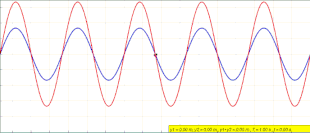 Note that Equation (1) does not describe a traveling wave. At any position x, y(x,t) simply oscillates in time with an amplitude that varies in the x-direction as .[9] The animation at the beginning of this article depicts what is happening. As the left-traveling blue wave and right-traveling green wave interfere, they form the standing red wave that does not travel and instead oscillates in place.