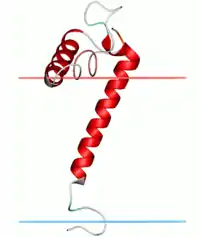 The cytoplasmic domain forms a distorted helix that is partially absorbed into the plane of the lipid bilayer. It interacts with the surface of the lipid bilayer, and contributes to the initiation of the apoptotic cascade on binding of the unstructured linker domain to dimethyltin.[1]