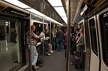 There were originally five Adtranz C-100 cars built by Westinghouse for the system, car bodies were built in Scotland by Walter Alexander before being shipped to Pittsburgh for assembly and testing. This was increased to nine when four new Adtranz CX-100 cars were delivered during the 1998 expansion.[1] During normal operation, eight out of the nine cars will be in service to maintain a 99.98% availability record.[1][3] The cars can operate as single units or can be coupled to form two or three car trains. The trains are fully automated and driverless.
