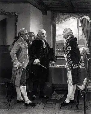 Lord Howe initially sought to meet with the men as private citizens since British policy did not recognize the Congress as a legitimate authority.[14] For the conference to take place, he agreed to the American demand to be recognized as official representatives of the Congress.[15][16]