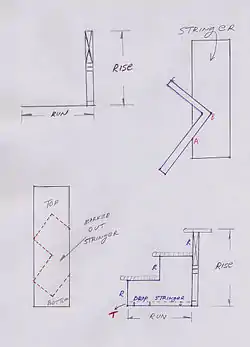 - The rise (vertical measurement), and the run (horizontal measurement). Note that the stringer will rest partially on the horizontal surface.