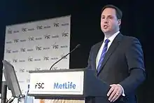 On 18 September 2013 Ciobo was appointed the Parliamentary Secretary to the Treasurer, Joe Hockey.[34] He was also appointed as Australia's alternate governor to the World Bank, Asian Development Bank and European Bank for Reconstruction and Development.[35] Ciobo was given responsibility for the Foreign Investment Review Board, the Australian Bureau of Statistics, the Royal Australian Mint, the National Housing Supply Council and the Australian Valuation Office.[35] Since his appointment, Ciobo has abolished both the National Housing Supply Council, saying the council's activities were "no longer needed";[36][37] and the Australian Valuation Office, saying "a compelling case for the Commonwealth providing its own valuation services no longer exists, particularly given there is a highly competitive market of private sector providers";[38][39] and announced plans to privatise the Royal Australian Mint.[40]