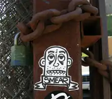 Sticker art (also known as sticker bombing, sticker slapping, slap tagging, and sticker tagging) is a form of street art in which an image or message is publicly displayed using stickers. These stickers may promote a political agenda, comment on a policy or issue, or comprise a subcategory of graffiti.[1]