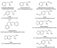 Substituted amphetamines are a class of compounds based upon the amphetamine structure;[35] it includes all derivative compounds which are formed by replacing, or substituting, one or more hydrogen atoms in the amphetamine core structure with substituents.[35][36][37] Examples of substituted amphetamines are amphetamine (itself),[35][36] methamphetamine,[35] ephedrine,[35] cathinone,[35] phentermine,[35] mephentermine,[35] bupropion,[35] methoxyphenamine,[35] selegiline,[35] amfepramone,[35] pyrovalerone,[35] MDMA (ecstasy), and DOM (STP). Many drugs in this class work primarily by activating trace amine-associated receptor 1 (TAAR1);[38] in turn, this causes reuptake inhibition and effluxion, or release, of dopamine, norepinephrine, and serotonin.[38] An additional mechanism of some substituted amphetamines is the release of vesicular stores of monoamine neurotransmitters through VMAT2, thereby increasing the concentration of these neurotransmitters in the cytosol, or intracellular fluid, of the presynaptic neuron.[39]