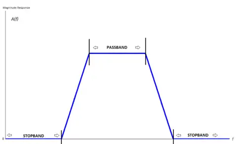 Frequency response of an example bandpass filter. The frequencies between a stopband and a passband define the transition band.