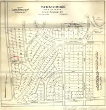 The subdivision was planned by 1917 and developed in 1919 by Clark & Porter, Inc. Marketing materials stated "...no smoke, no dirt, no fogs, no two-family or apartment houses, no business places of any kind, nothing but homes." [3] An extension of the middle class and upper middle class Summit Avenue residential neighborhood on the other side of Onondaga Park and Hiawatha Lake, Strathmore was marketed as "an exclusive residential district" when it officially opened on September 27, 1919. It attracted solidly middle class and upper middle class residents into various enclaves such as Robineau Road. The original advertisement flyer proclaimed "There can be no cheap homes in Strathmore by the Park", referring to Onondaga Park. Strathmore was zoned strictly residential, allowing for only single-family homes with a garage. It also contains many rental properties in the "less greater" section past Summit Ave.