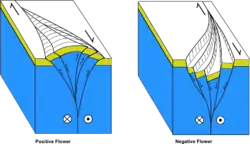 In detail, many strike-slip faults at surface consist of en echelon and/or braided segments in many cases probably inherited from previously formed Riedel shears. In cross-section, the displacements are dominantly reverse or normal in type depending on whether the overall fault geometry is transpressional (i.e. with a small component of shortening) or transtensional (with a small component of extension). As the faults tend to join downwards onto a single strand in basement, the geometry has led to these being termed flower structure. Fault zones with dominantly reverse faulting are known as positive flowers, those with dominantly normal offsets are known as negative flowers. The identification of such structures, particularly where positive and negative flowers are developed on different segments of the same fault, are regarded as reliable indicators of strike-slip.[4]