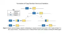 There are several structural variants in the human genome that have been observed but have not led to any obvious phenotypic effects.[1] There are some, however, that play a role in gene dosage which could lead to genetic diseases or distinct phenotypes. Structural variants can directly affect gene expression, such as with copy-number variants, or indirectly through position effects.[1] These effects can have significant implications in susceptibility to disease. The first gene dosage effect that was observed, and considered to be an autosomal dominant disease from an inherited DNA rearrangement, was Charcot-Marie Tooth (CMT) disease. Most of the associations found with CMT were with a 1.5 Mb tandem duplication in 17p11.2-p12 at the PMP22 gene.[11] The proposed mechanism for the structural variation is shown in Figure 2. When an individual has three copies of the normal gene, it results in the disease phenotype.[11] If the individual had only one copy of the PMP22 gene, on the other hand, the result was a clinically different heredity neuropathy with liability to pressure palsies.[11] The differences in gene dosage created vastly different disease phenotypes which revealed the significant role that structural variation has on phenotype and susceptibility to disease.