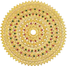 ![]() A model of Sudarshana Chakra made in gold with studded gemstones | |