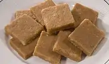 Sukhadi is made from Ghee (clarified butter), wholewheat flour and jaggery. The wholewheat flour is roasted in ample amount of ghee till it turns aromatic and brownish. Grated jaggery, in equal amount of flour is added to the mixture after removing pan from the heat, and stirred to make a mixture that is transferred to a plate to set. After making level of the mixture, pieces are created.