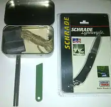 "Mini survival kits" or "Altoids tin" survival kits are small kits that contain a few basic survival tools. These kits often include a small compass, waterproof matches, minimum fishing tackle, large plastic bag, small candle, jigsaw blade, craft knife or scalpel blade, and/or a safety pin/s. Pre-packaged survival kits may also include instructions in survival techniques, including fire-starting or first aid methods. In addition, parachute cord can be wrapped around the tin. The parachute cord can be used for setting up an emergency shelter or snaring small animals. They are designed to fit within a container roughly the size of a mint tin.