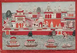 On one occasion Satrajit, a Yadava nobleman, and a devotee of Surya, the Sun God, was walking along the sea shore, praying ardently, when the god himself appeared before him. Seeing the god in an indistinct and dazzling fiery shape, Satrájit asked him to appear in a less blinding form, so that he could see him clearly. For this, the Sun God took the Syamantaka jewel off his neck, and Satrájit saw him of a dwarfish stature, with a body like burnished copper, and with slightly reddish eyes. Having offered his adorations, the Sun God offered him a boon, and he asked for the jewel. When Satrájit returned to Dwarka with the jewel, people mistook him for the Sun God, such was his dazzling glory that even Krishna asked him to present the jewel to Ugrasena, the supreme leader of the Yadavas, but Satrájit did not comply.[3]