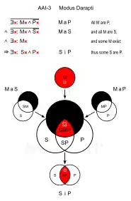The following table shows all syllogisms that are essentially different. The similar syllogisms share the same premises, just written in a different way. For example "Some pets are kittens" (SiM in Darii) could also be written as "Some kittens are pets" (MiS in Datisi).