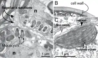 The coccoid cell is surrounded by a cellulosic, usually smooth cell wall that contains large-molecular-weight proteins and glycoproteins.[34][65] Cell walls grow thicker in culture than in hospite (Fig 11B).[7] The cell membrane (plasmalemma) is located beneath the cell wall yet little is known about its composition and function in terms of the regulation of trans-membrane transport of metabolites. During karyokinesis and cytokinesis, the cell wall remains intact until the mastigotes escape the mother cell. In culture, the discarded walls accumulate at the bottom of the culture vessel. It is not known what becomes of the walls from divided cells in hospite.[66] One species, S. pilosum, possesses tufts of hair-like projections from the cell wall; this is the only known surface characteristic used to diagnose a species in the genus.