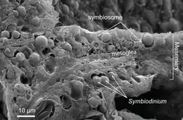 Many Symbiodinium are known primarily for their role as mutualistic endosymbionts. In hosts, they usually occur in high densities, ranging from hundreds of thousands to millions per square centimeter.[4] The successful culturing of swimming gymnodinioid cells from coral led to the discovery that "zooxanthellae" were actually dinoflagellates.[5][6] Each Symbiodinium cell is coccoid in hospite (living in a host cell) and surrounded by a membrane that originates from the host cell plasmalemma during phagocytosis (Figures 2B and 3). This membrane probably undergoes some modification to its protein content, which functions to limit or prevent phago-lysosome fusion.[7][8][9] The vacuole structure containing the symbiont is therefore termed the symbiosome. A single symbiont cell occupies each symbiosome. It is unclear how this membrane expands to accommodate a dividing symbiont cell. Under normal conditions, symbiont and host cells exchange organic and inorganic molecules that enable the growth and proliferation of both partners.
