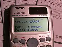 A syntax error is one of several types of errors on calculators (most commonly found on scientific calculators and graphing calculators), representing that the equation that has been input has incorrect syntax of numbers, operations and so on. It can result in various ways, including but not limited to: