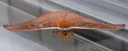 The wingspan is about 120–140 mm and variable in color from yellowish to brown or purplish-grey. The wings have zigzag markings, sometimes with dark splotches, and a small circular spot on each wing.[1] The larvae are large greenish spiny caterpillars that feed on various plants, including Euodia elleryana, Geijera salicifolia, Glochidion ferdinandi, Petalostigma quadriloculare, Aegiceras, Ceriops, Timonius rumphii and Podocarpus spinulosus.