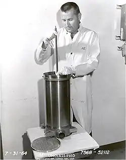 "In general, the SNAP 11 fuel block is a cylindrical multi-material unit which occupies the internal volume of the generator. TZM (molybdenum alloy) fuel capsule, fueled with curium-242 (Cm2O3 in an iridium matrix) is located in the center of the fuel block. capsule is surrounded by a platinum sphere, approximately 2 - 1 / 4 inches in diameter, which provides shielding and acts as an energy absorber for impact considerations. This assembly is enclosed in graphite and beryllium sub-assemblies to provide the proper thermal distribution and ablative protection."[10]