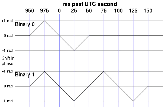 One signal element consists of the phase of the carrier shifted linearly by +1 rad in 25 ms (known as "ramp A"), then shifted linearly by −2 rad over 50 ms ("ramp B"), then shifted linearly again by +1 rad for another 25 ms ("ramp C"), returning the phase to zero. One signal element is always sent at each second between 0 and 58. Two signal elements are sent in sequence to represent a binary one; otherwise it is interpreted as binary zero. During ramp B of the initial signal element, the exact point the signal phase is at zero represents the top of the UTC second. Since the phase is the integral of the frequency, this triangular phase modulation at 40 rad/s corresponds to a square frequency modulation with a deviation of 20/π ≈ 6.37 Hz.