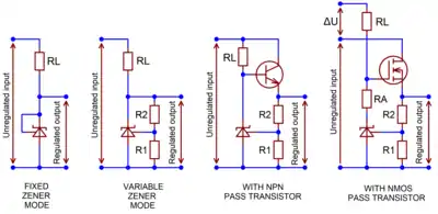 Adding an emitter follower converts a shunt regulator into a series regulator. Efficiency is mediocre because single npn-type transistors or Darlington pairs require fairly a high collector-emitter voltage drop.[28] A single common-emitter pnp-type transistor can operate correctly in saturation mode, with only ≈0.25 voltage drop but also with impractically high base currents.[29] A compound pnp-type transistor does not need as much drive current, but requires at least a 1 V voltage drop.[29] An N-channel power MOSFET device enables the best combination of low drive current, very low dropout voltage, and stability.[29] However, low-dropout MOSFET operation requires an additional high-side voltage source (ΔU in schematic) for driving the gate.[29]