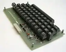 Today keyboards are readily available and inexpensive, and they have a standard interface. In 1973, new keyboards were only available to computer and terminal manufacturers. Surplus keyboards were available to hobbyists but they often produced codes other than ASCII, such as baudot or EBCDIC. The TV Typewriter project and kit did not include a keyboard. The unit on the September cover shows a keyboard project Don Lancaster did in the February 1973 issue.[10] This project involved hand crafting 55 key-switches including fabricating the springs for each key-switch. Most hobbyists chose to use a surplus keyboard and modified it to produce ASCII codes. Don Lancaster's prototype TV Typewriter which is now on display at the Computer History Museum has a surplus keyboard with an ASCII encoder circuit that was published in the February 1974 issue of Radio-Electronics.[11] The plans for this encoder were also included in the TV Typewriter booklet