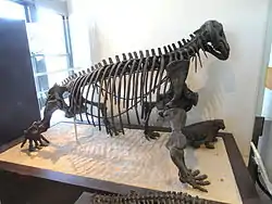 Mounted skeleton of Moschops capensis. The skeleton is displayed at the American Museum of Natural History
