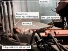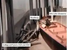 Despite several changes of course, the ship proved unmanageable due to its insufficient speed relative to the current. In desperation the captain ordered 'full speed astern', at which point all control was lost. The vessel drifted towards the bridge midway between the central navigation span and the eastern shore, crashing into the pile capping of piers 18 and 19, bringing three unsupported spans and a 127 m section of roadway crashing into the river and onto the vessel's deck. The ship listed to starboard and sank within minutes in 35 m of water a short distance to the south. Seven crew members on the Lake Illawarra were trapped and drowned. The subsequent marine court of inquiry found that the captain had not handled the ship in a proper and seamanlike manner, and his certificate was suspended for six months.[2]