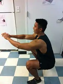 The second way to prevent a meniscus tear is to strengthen and stretch the major leg muscles.[14] Those muscles include the hamstrings, quadriceps, and calf muscles. One popular exercise used to strengthen the hamstrings is the leg curl. It is also important to properly stretch the hamstrings; doing standing toe touches can do this. Seated leg extensions strengthen the quadriceps and doing the quadriceps stretch will help loosen the muscles. Toe raises are used to strengthen and stretch the calves.[14] Adequate muscle mass and strength may also aid in maintaining healthy knees. The use of the parallel squat increases much needed stability in the knee if executed properly. Execution of the parallel squat will develop the lower body muscles that will strengthen the hips, knees, and ankles.[15]