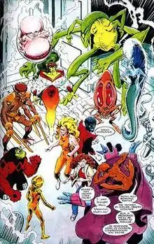 - Waxworks a blobbish, jellyfish like, non-humanoid alien from the same species as deceased member Elmo, but has the power to "soften" its opponents—to the point where their bodies stretch and distort out of control—with a touch.