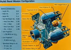TRS was a design for an uncrewed robotic spacecraft designed to be capable of remote payload observation and boosting or de-orbiting another spacecraft, and it was developed to potentially re-boost the Skylab space station to a higher orbit.[2] After Skylab 4, the third crewed mission to Skylab, plans were made to boost the station into a higher orbit to extend its service life or to de-orbit it into a remote ocean area.[3] A remotely controlled booster rocket was to be carried up in the Space Shuttle's third mission. Astronaut Jack R. Lousma described the remote booster as "as big as a truck" and requiring a control system able to match the circular motion of the Skylab docking port.[4] The core of TRS was a propulsion system that could accommodate additional fuel modules. It had a 24 nozzle 6-axis control thruster system to support Space rendezvous, docking, and orienting the spacecraft.[2]
