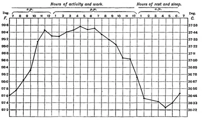 Temperature is a measure of a quality of a state of a material.[37] The quality may be regarded as a more abstract entity than any particular temperature scale that measures it, and is called hotness by some writers.[38] The quality of hotness refers to the state of material only in a particular locality, and in general, apart from bodies held in a steady state of thermodynamic equilibrium, hotness varies from place to place. It is not necessarily the case that a material in a particular place is in a state that is steady and nearly homogeneous enough to allow it to have a well-defined hotness or temperature. Hotness may be represented abstractly as a one-dimensional manifold. Every valid temperature scale has its own one-to-one map into the hotness manifold.[39][40]