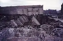 The Templo Mayor (Spanish for "[the] Greater Temple") was the main temple of the Aztec people in their capital city of Tenochtitlan, which is now Mexico City. Its architectural style belongs to the late Postclassic period of Mesoamerica. The temple was called the Huēyi Teōcalli [we:ˈi teoːˈkali][1] in the Nahuatl language. It was dedicated simultaneously to Huitzilopochtli, god of war, and Tlaloc, god of rain and agriculture, each of which had a shrine at the top of the pyramid with separate staircases. The spire in the center of the adjacent image was devoted to Quetzalcoatl in his form as the wind god, Ehecatl.[2] The Great Temple devoted to Huitzilopochtli and Tlaloc, measuring approximately 100 by 80 m (328 by 262 ft) at its base, dominated the Sacred Precinct.[3] Construction of the first temple began sometime after 1325, and it was rebuilt six times. The temple was destroyed by the Spanish in 1521 to make way for the new cathedral.[4]