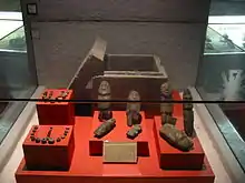 Most of the objects found in the Templo Mayor were offerings. Although many are of Mexica design, there are also abundant items from other peoples, brought in as tribute or through trade. Sculptures, flint knives, vessels, beads and other sumptuary ornaments—as well as minerals, plants and animals of all types, and the remains of human sacrifice—were among the items deposited in offerings. All of these fulfilled a specific function within the offering, depending on the symbolism of each object. In excavations at the Templo Mayor, different types of offerings have been found and have been grouped by researchers in terms of Time (the period in which the offering was deposited); Space (the location of the offering within the structure); Container (type and dimensions of the receptacle containing the objects); internal distribution (placement of objects within the offering) and value of the items. The offerings were usually contained in cavities, in stone urns, and in boxes made of slabs. These are found under floors; in platforms, architectural bodies, stairways and in temples. These offerings were placed accompanied by complex rituals following set temporal, spatial and symbolic patterns, depending on the intention of the offering.[24]