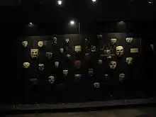 Another theme exhibited in this hall is autosacrifice, a ritual that was conducted in private as a personal act of communication with the gods. Widespread throughout the entire population, this practice was performed by perforating certain fleshy parts of the body—such as the earlobes, lips, tongue, chest, calves, et cetera—with obsidian blades, agave needles or bone perforators. Once the implement was covered with blood, it was inserted in straw balls called Zacatapayoli. The entirety was probably placed in ceremonial boxes—tepetlacalli—as an offering to the gods. Objects associated with human sacrifice are the "face blades" or knives decorated with eyes and teeth, as well as skull masks. Other ceremonial items include musical instruments, jewelry, and braziers for the burning of copal.[24]