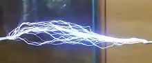 The above peak voltage is only achieved in coils in which air discharges do not occur; in coils which produce sparks, like entertainment coils, the peak voltage on the terminal is limited to the voltage at which the air breaks down and becomes conductive.[20][25][27] As the output voltage increases during each voltage pulse, it reaches the point where the air next to the high voltage terminal ionizes and corona, brush discharges and streamer arcs, break out from the terminal. This happens when the electric field strength exceeds the dielectric strength of the air, about 30 kV per centimeter. Since the electric field is greatest at sharp points and edges, air discharges start at these points on the high voltage terminal. The voltage on the high voltage terminal cannot increase above the air breakdown voltage, because additional electric charge pumped into the terminal from the secondary winding just escapes into the air. The output voltage of open-air Tesla coils is limited to a few million volts by air breakdown,[15] but higher voltages can be achieved by coils immersed in pressurized tanks of insulating oil.