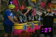 - Human Pinata - A staffer wears a ski-doo helmet, a neck brace, and safety goggles then climbs to the top of a ladder. They hang a brown paper bag from their neck and wait for the host (Dan) to ask the blindfolded contestant a question. If the contestant answers correct, they are given a cardboard tube to swing at the "pinata", where they can win the treats inside the bag.