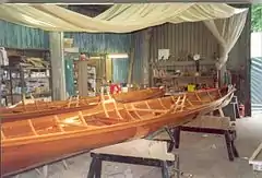 The Thames skiff owes its origins to the clinker boat building technique, of over-lapping timber planking, that's known to have existed in the region from before the 6th century Anglo-Saxon Snape and Sutton Hoo ship burials. Many of the terms used for parts of the skiff are of Germanic origin – "tholes", "thwarts", and "sax". Planks on either side of a wooden keel are laid down following the outline of a sham (temporary pattern) placed across the keel. The planks are nailed in place and then a transverse strengthening framework of ribs is added. Oars (or blades) are held in place by wooden thole pins at the side of the boat rather than rowlocks or outriggers. The thole pins are designed to give way if too much pressure is put on them, thus protecting the boat itself from damage. The thwart, or seat, is fixed rather than sliding as in modern boats. The sax runs round the top of the boat to strengthen and protect it.[1] Blades are made of wood with leather collars.