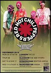 The band's European headlining tour began on September 1, 2016 and lasted until mid-December 2016. Deap Vally and Babymetal served as the opening acts. "Feasting on the Flowers" made its live debut on September 8, 2016 in Oslo, followed by "The Longest Wave" second time ever played on September 14 in Helsinki. "Search and Destroy" was performed for the first time since 2003 on September 10, 2016 in Sweden and for the first time with Klinghoffer. At the band's show of October 10, 2016 in Italy, Anthony's 9-year-old son Everly Bear joined his father in singing "Dreams of a Samurai".[20] "Don't Forget Me" was briefly teased in tribute to a fan from Peru who died the previous year. The band's show of October 13, 2016 in Montpellier was cancelled due to weather conditions. The band is trying to reschedule the show.[21] "The Zephyr Song" (which was in the band's setlist on November 1, 2016 but dropped in favor of "Soul to Squeeze") was performed for the first time since 2004 and first time with Josh on November 3, 2016. At the band's show of November 9, 2016 in Amsterdam they performed "Mommy Where's Daddy?". This was only the third time since 1999 the song has been performed. They had previously performed the song acoustically in September 2016 and once in September 2015. "Emit Remmus" was performed for the first time since 2012 while "Catholic School Girls Rule" and "Freaky Styley" were for teased at during the band's show of November 16, 2016 in Denmark. On November 17, 2016 in Germany the band performed "Yertle the Turtle" for the first time since 2001. The song was dedicated to one of the band's longtime fans who had been following them on the tour. Due to Kiedis suffering from flu like symptoms, the band was forced to postpone their December 20 and 21 shows in Ireland until September 20 and 21, 2017.[22]