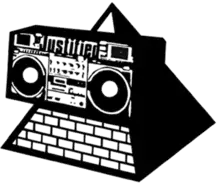The "Pyramid Blaster" is a logo and icon frequently and prominently depicted within the duo's collective work: a pyramid, in front of which is suspended a ghetto blaster displaying the word "Justified".[54][110] This references the Eye of Providence icon, often depicted as an eye within a triangle or pyramid, a significant symbol of Illuminatus![117] The pyramid was also a theme of the duo's 1997 and 2017 reunions, with the proposed building by K2 Plant Hire of a "People's Pyramid" (in 1997, a pyramid built with as many bricks as there were births in the 20th century in the UK,[85] and in 2017 a pyramid built from bricks containing the ashes of dead people).[97]